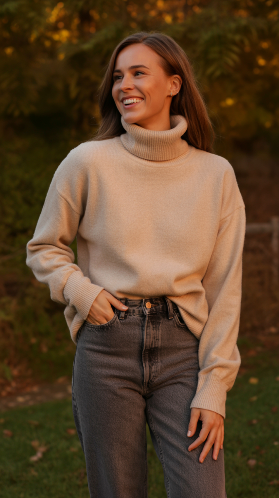 The classic turtleneck tucked into high-waisted jeans creates a sleek, elongated silhouette.