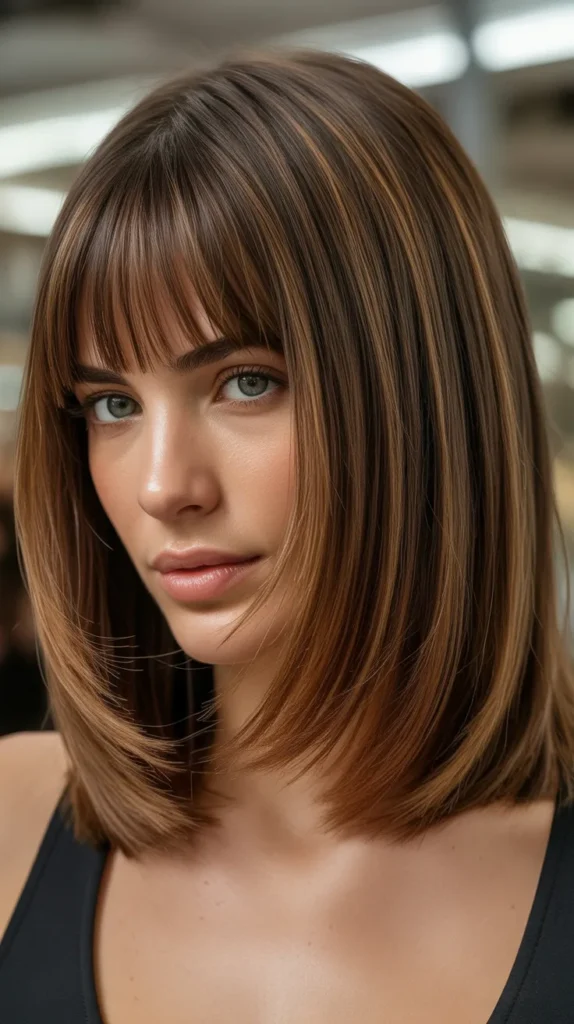 Adding balayage highlights to a long bob with curtain bangs introduces dimension, depth, and sun-kissed vibrancy.
