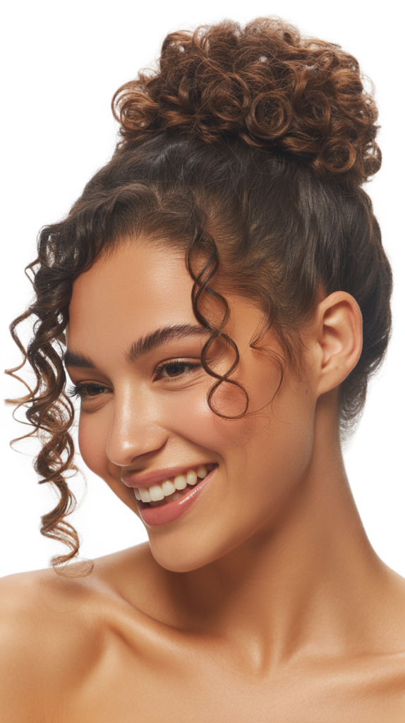 - This updo works by gathering curls into a high position and arranging them in a rounded bun shape that showcases curl patterns.