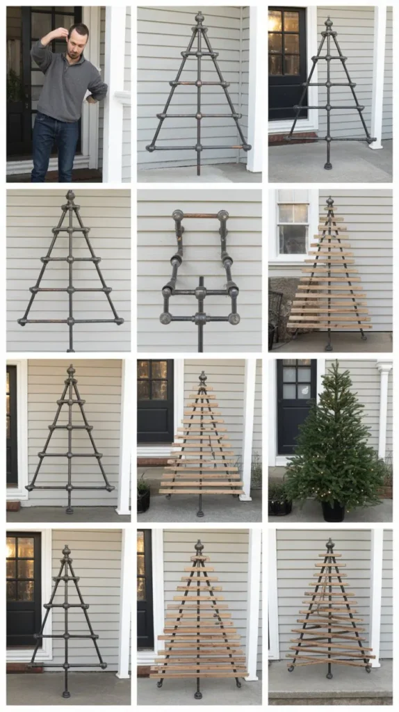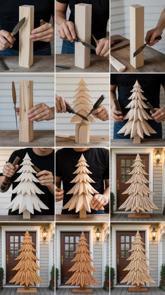 - Wooden star toppers painted in gold, red, or natural finish complete the tree silhouette