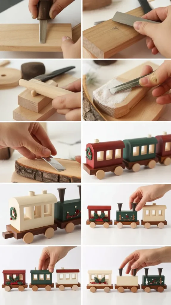 Wooden Christmas train sets evoke nostalgic imagery of toys under the tree while providing decorative display pieces. These playful items appeal to collectors, families with children, and those valuing traditional Christmas symbols.