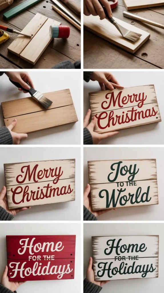 - Stenciled messages like “Joy,” “Noel,” or “Merry Christmas” add text elements without complicated painting