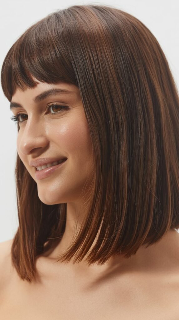 This timeless variation features a straight, polished long bob that falls just above the shoulders, paired with soft curtain bangs that frame the face beautifully from a center part.
