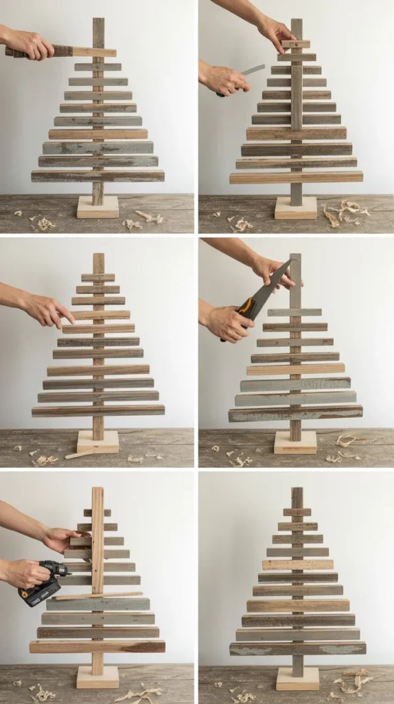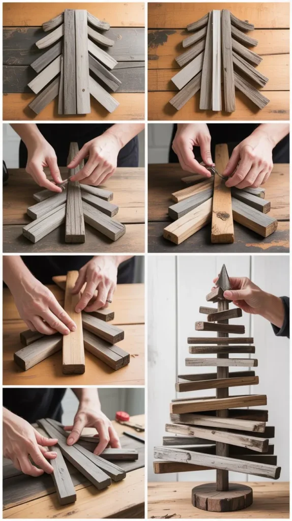 Creating a Christmas tree from a random assortment of reclaimed wood scraps in varying sizes, colors, and finishes celebrates resourcefulness while producing a truly one-of-a-kind piece.