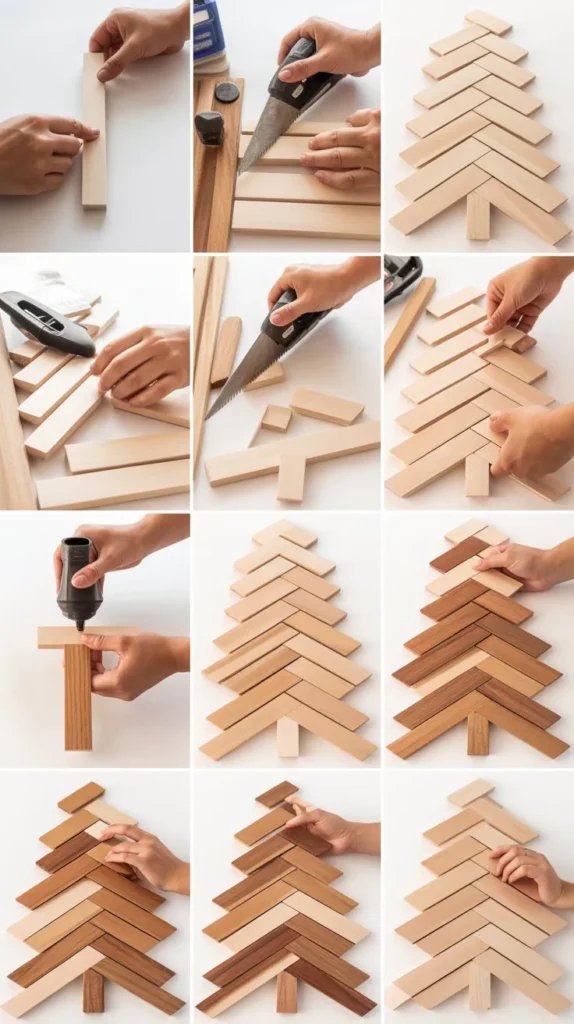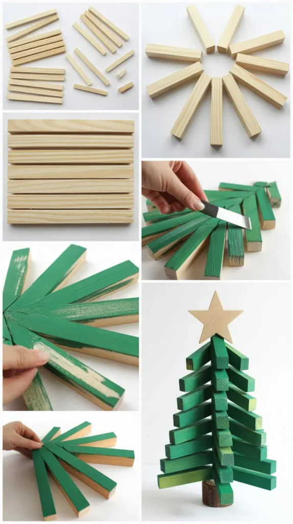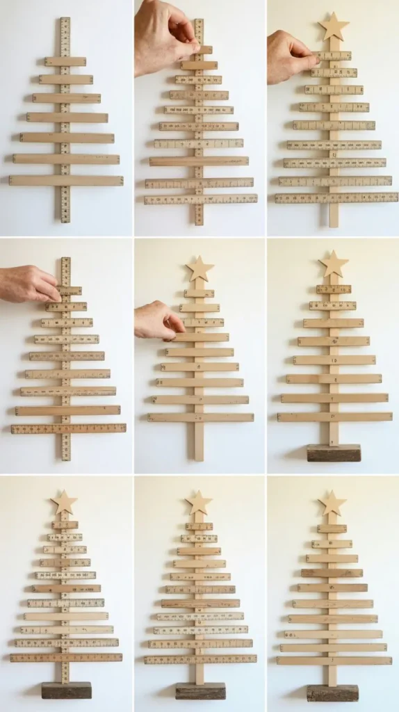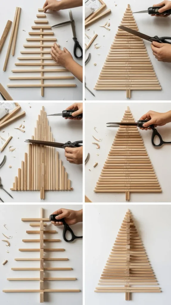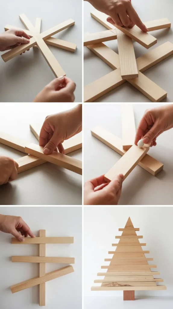 This contemporary design uses wooden dowels arranged in a geometric pattern to create a minimalist yet striking Christmas tree that appeals to modern sensibilities.