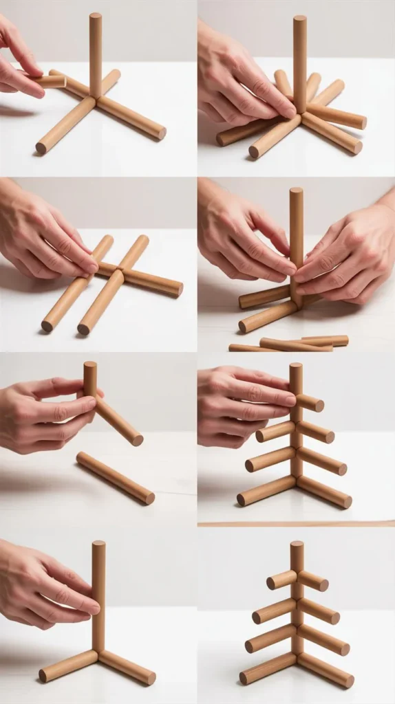 - Drill pilot holes at consistent intervals along a central vertical dowel that serves as the tree’s spine.