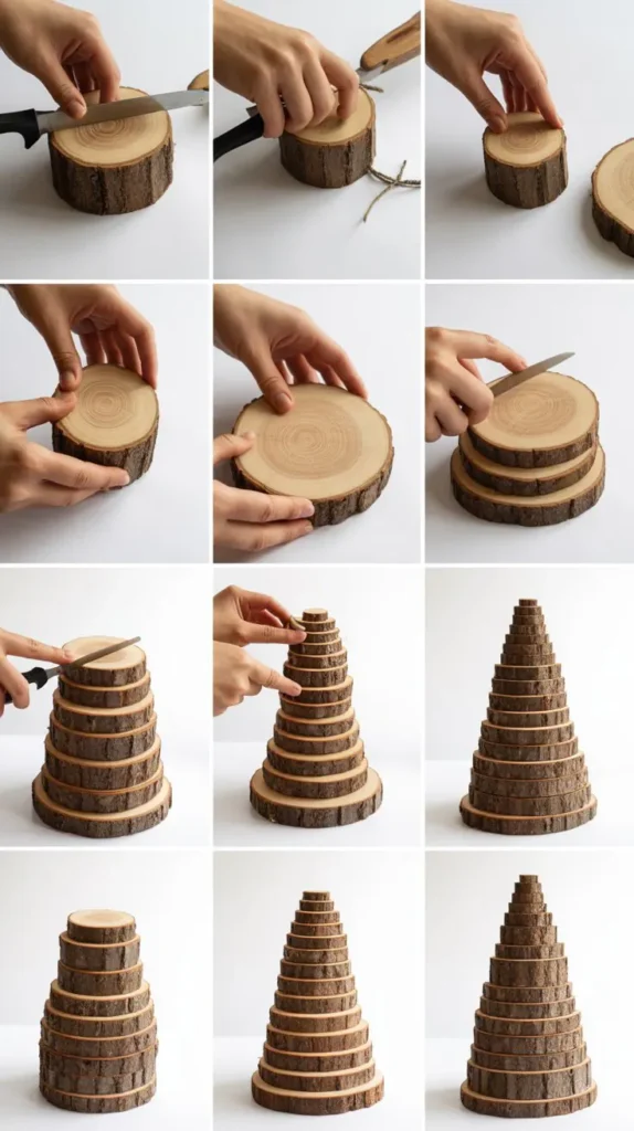 - Cut dowels into graduated lengths using a miter saw, creating 15-20 pieces that decrease in size from bottom to top.
