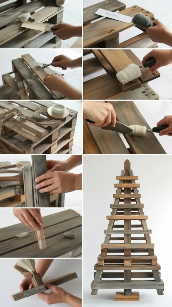 Creating a Christmas tree from reclaimed pallet wood brings an authentic farmhouse aesthetic to your holiday décor while being incredibly budget-friendly.
