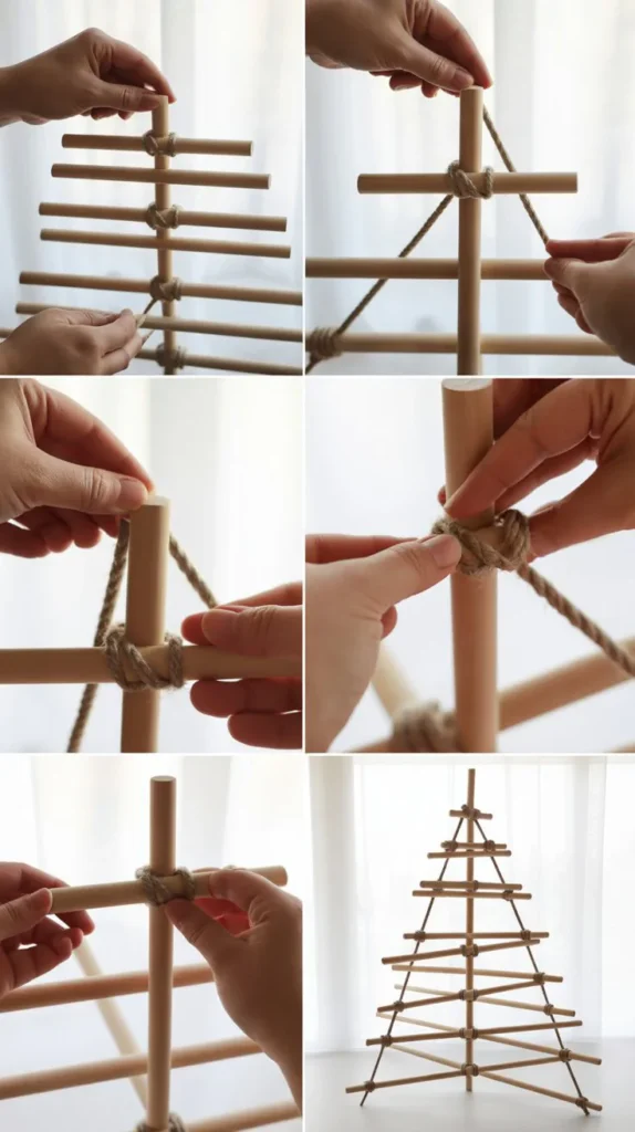 - Alternatively, use a rope or thick cord threaded through drilled holes in each dowel for a suspended version that can be easily disassembled for storage.